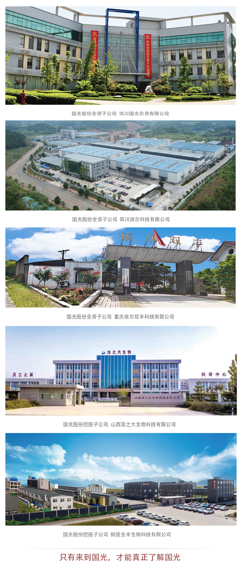 公司下屬的四川國光農(nóng)資有限公司、四川國光園林科技有限公司、四川潤爾科技有限公司、重慶依爾雙豐科技有限公司、山西浩之大生物科技有限公司、鶴壁全豐生物科技有限公司、四川蕓領(lǐng)農(nóng)業(yè)技術(shù)服務(wù)有限公司、成都國光現(xiàn)代農(nóng)業(yè)職業(yè)技能培訓(xùn)學(xué)校有限公司等十五家公司分布于四川省、山西省、河南省、海南省、重慶市等。ㄖ陛犑校,并在全國設(shè)有二十五個物流倉儲服務(wù)中心。公司堅持“敬業(yè)、高效、務(wù)實、創(chuàng)新”的企業(yè)精神,聚焦調(diào)節(jié)劑、水溶性肥料、園林養(yǎng)護品等優(yōu)勢品類,堅持“全員服務(wù)、創(chuàng)造價值;全心服務(wù),成就用戶”的服務(wù)理念,突出技術(shù)服務(wù)的核心作用,產(chǎn)品在配合綠色防控、提質(zhì)減量、抗災(zāi)減害、減少人工、配合機械化等方面起著重要作用,“國光”“雙豐”“浩之大”“國光園林”“鶴壁全豐”品牌影響力持續(xù)擴大。