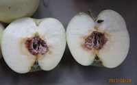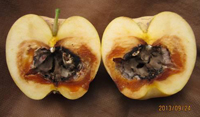 只危害果實。分為霉心型和心腐型。初期心室組織變褐壞死,后向外擴展,果肉變褐色或者深褐色,味苦,可從果柄洼出爛透。心室內充滿白色、黑褐色、青綠色或者粉紅色霉層,以粉紅色霉層最常見。幼果發(fā)病,內外常包敷紅粉。北斗、元帥系品種的病果易脫落,青香蕉的病幼果多在樹上變黃,國光則干縮成黑色小僵果,掛在樹上經(jīng)冬不落。