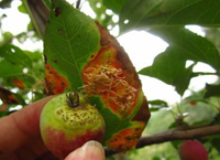 病菌在檜柏上為害小枝,即以茵絲體在菌癭中越冬。第二年春天形成褐色的冬孢子角。冬孢子柄被有膠質,遇降雨或空氣極潮濕的胺化膨大,冬孢子萌發(fā)產(chǎn)生大量擔孢子,隨風傳播到蘋果樹上。銹菌侵染蘋果樹葉片、葉柄、果實及當年新梢等,發(fā)病期持續(xù)一個月。
