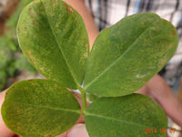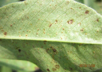 癥狀:花生銹病在各個生育階段都可發(fā)生,但以結(jié)莢期以后發(fā)生嚴(yán)重。主要侵染花生葉片,亦可為害葉柄、托葉、莖稈、果柄和莢果。葉片染病初在葉片正面或背面出現(xiàn)針尖大小淡黃色病斑,后擴(kuò)大為淡紅色突起斑,表皮破裂露出紅褐色粉末狀物,即病菌夏孢子。下部葉片先發(fā)病,漸向上擴(kuò)展。葉上密生夏孢子堆后,很快變黃干枯,似火燒狀。葉柄、托葉、莖、果柄和果殼染病夏孢子堆與葉上相似,托葉上的夏孢子堆稍大;葉柄、莖和果柄上的夏孢子堆橢圓形,長1~2mm,但夏孢子數(shù)量較少。