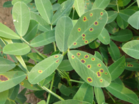 發(fā)病規(guī)律:春花生早播病輕,秋花生早播則病重。施氮過多,密度大,通風(fēng)透光不良,排水條件差,發(fā)病重。水田花生較旱田病重。高溫、高濕、溫差大利于病害蔓延。