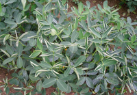 癥狀:(1)葉片:通常先從葉尖開始發(fā)病,少數(shù)從葉緣發(fā)病,病斑呈楔形或半圓形,由初期褪綠漸變黃、變褐,邊緣深褐色,周圍有黃色暈圈,后變灰褐、枯死破裂,狀如焦灼,上生許多小黑點即病菌子囊殼。葉片中部病斑初與黑斑病、褐斑病相似,后擴(kuò)大成近圓形褐斑。該病常與黑斑病、褐斑病混生,有明顯胡麻斑狀。在焦斑病病斑內(nèi)有黑斑病或褐斑病或褐斑病、銹病斑點。收獲前多雨情況下,該病出現(xiàn)急性癥狀。葉片上產(chǎn)生圓形或不定形黑褐色小漬狀大斑塊,迅速蔓延造成全葉枯死,變黑褐色,并發(fā)展到葉柄、莖、果針上。(2)莖及葉柄:病斑呈不規(guī)則形,淺褐色,水漬狀,上生小黑點。