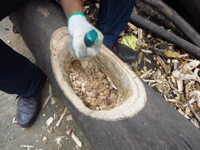 1、在樹(shù)干上用銼刀挖出一個(gè)樹(shù)洞,將樹(shù)洞邊緣及底部修整平(圖1);