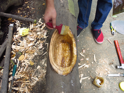 2、用ACQ木材防腐劑或熟桐油分別涂刷挖好的樹(shù)洞,一種防腐材料涂抹一半的樹(shù)洞(圖2);