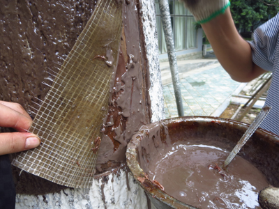 4、用剪刀剪下一塊與樹(shù)洞洞口大小一致的鐵皮(圖4)及制作好的仿真樹(shù)皮,將國(guó)光仿真樹(shù)皮專用膠及顏料調(diào)勻,涂抹在仿真樹(shù)皮背面后,將仿真樹(shù)皮粘貼在剪好的鐵皮上(圖5);