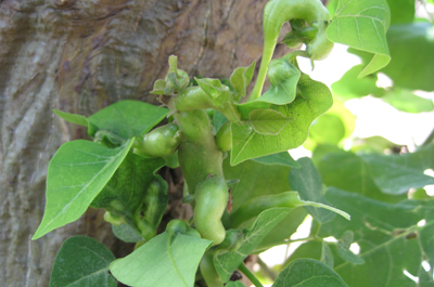 刺桐姬小蜂專一危害刺桐屬植物,該蟲生殖能力很強,通常一旦出現(xiàn)輕微感染,短時間內(nèi)便會擴散到全株。刺桐姬小蜂將卵產(chǎn)于刺桐嫩葉和葉柄組織內(nèi), 幼蟲在植物組織內(nèi)生長發(fā)育。由于植物組織受到幼蟲唾液分泌物刺激而增生, 呈水泡狀膨大, 并在葉片背面和葉柄上形成瘤狀蟲癭。蟲癭很快蔓延到全株, 致使全株葉片組織膨大,發(fā)展形成畸形、卷曲的病葉,嚴重影響整體景觀效映。幼蟲在蟲癭內(nèi)化蛹, 羽化的成蟲從蟲癭的羽化孔飛出。姬小蜂除了造成蟲癭, 使枝葉膨大、扭曲變形, 降低刺桐的觀賞價值外, 還會使形成蟲癭的枝、葉和旁邊的嫩枝、嫩芽枯死,葉片脫落。新發(fā)的葉片、嫩枝不斷受到感染, 無法長出健康的枝葉進行光合作用,到后期直接造成刺桐樹死亡。