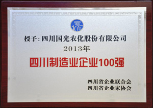 2013年11月19日,四川省企業(yè)聯(lián)合會(huì)、四川省企業(yè)家協(xié)會(huì)在成都金牛賓館召開2013四川企業(yè)100強(qiáng)、四川制造業(yè)企業(yè)100強(qiáng)、四川服務(wù)業(yè)企業(yè)50強(qiáng)發(fā)布暨企業(yè)發(fā)展峰會(huì),四川國光農(nóng)化股份有限公司榮獲四川制造業(yè)企業(yè)100強(qiáng)。