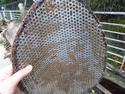 4、用剪刀剪下一塊與樹(shù)洞洞口大小一致的鐵皮(圖4)及制作好的仿真樹(shù)皮,將國(guó)光仿真樹(shù)皮專用膠及顏料調(diào)勻,涂抹在仿真樹(shù)皮背面后,將仿真樹(shù)皮粘貼在剪好的鐵皮上(圖5);